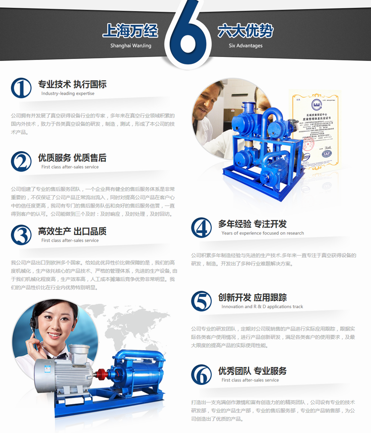 上海萬經(jīng)泵業(yè)制造有限公司是一家集生產(chǎn),銷售,研發(fā)于一體的企業(yè)。公司多年來憑借完善的質(zhì)量管理體系,先進的加工設備和加工工藝,及先進的檢測手段,高素質(zhì)的隊伍,研發(fā)制造銷售上萬臺國內(nèi)先進水平的真空設備。公司己通過ISG9001-2008質(zhì)量管理體系認證。公司主要產(chǎn)品有水環(huán)式真空泵,旋片式真空泵,羅茨真空機組,成套真空設備。公司生產(chǎn)的各類真空產(chǎn)品廣泛地應用于航空、電子、化工、醫(yī)藥、環(huán)保、煉油、冶金、紡織、食品、環(huán)保等高科技領域。